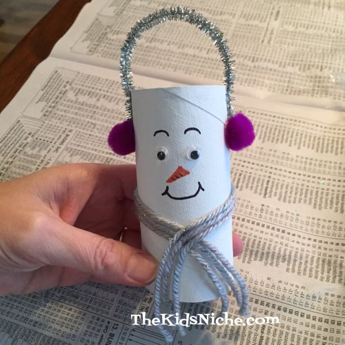 I cut 2 brown pipe cleaners in half and wrapped one half-piece around another to make some stick arms for the snowman. You can also cut some arms out of paper instead.