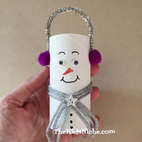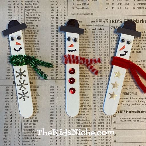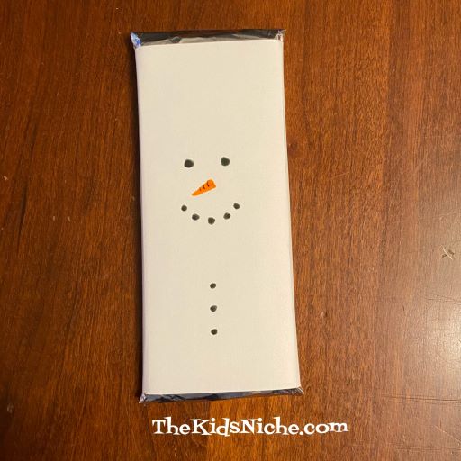 Add 2 wiggly eyes, some black pom poms or buttons and an orange carrot nose and a black hat cut from paper.