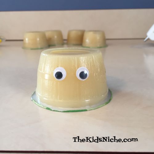 Let’s start with the reindeer. Turn the applesauce cup upside down. Find a clear spot on the side that doesn’t have the expiration date stamped on it. Glue 2 eyes onto the side a little more than half way up.