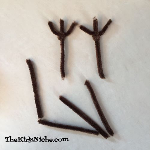 Now take a dark brown pipe cleaner and cut it into fourths. Hold one piece while wrapping a second piece around it a couple of times…then bend them to look like the picture below. Yep, you guessed it – antlers! 🙂 Make 2 for each reindeer.