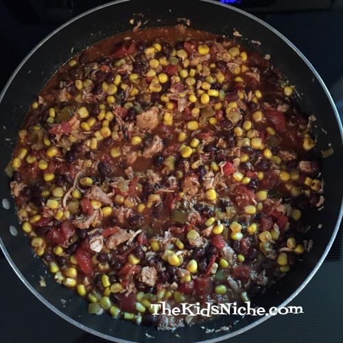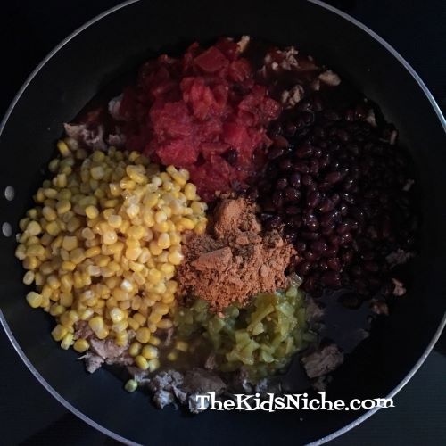 If you are using hamburger, start by browning it in a large skillet. After the hamburger is cooked thoroughly, (or if you are using cooked pork) mix the meat, corn, black beans, diced tomatoes, the package of taco seasoning and diced green chiles, together in a large skillet and heat until everything is heated through.