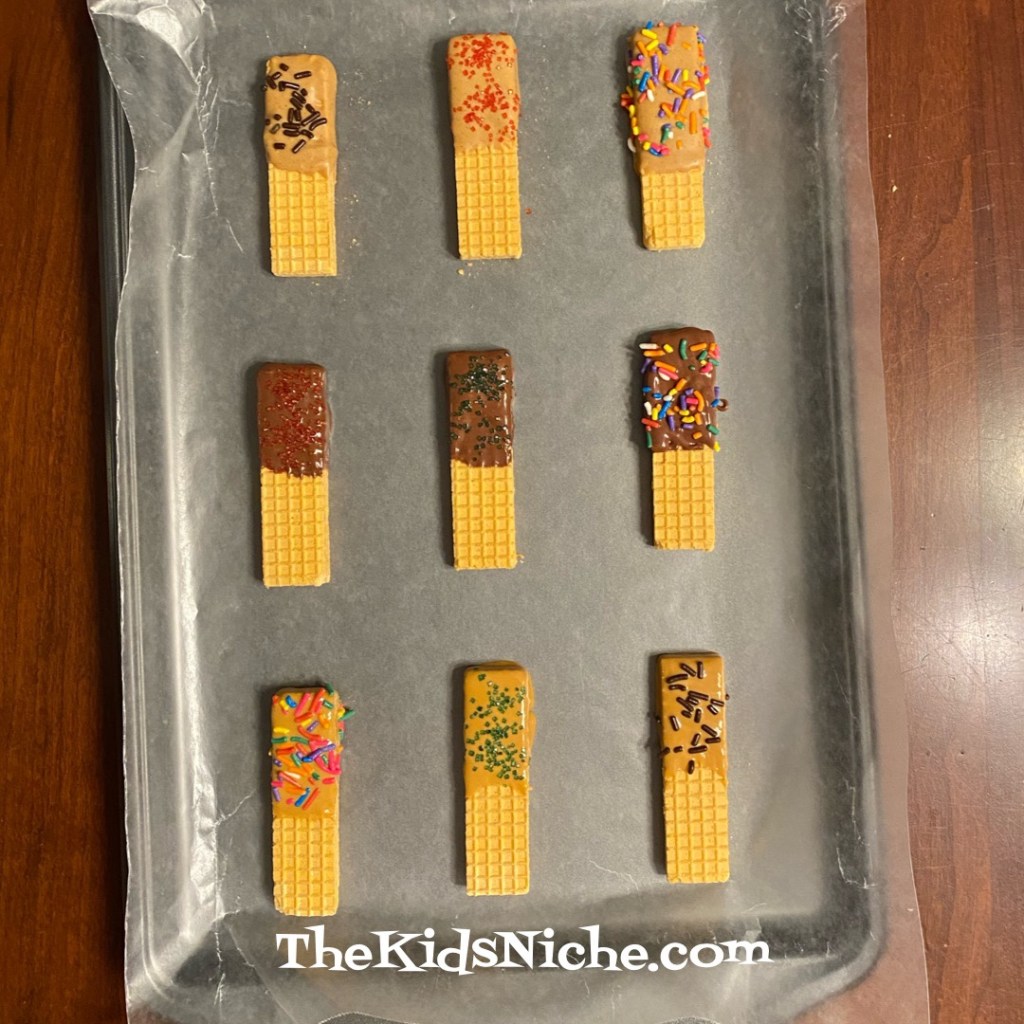 I bet it’s starting to smell good at your house! 😃 Do the same with each type of candy chips you are using. Melt the candy, dip the cookie in it and then lay the cookie on waxed paper and add your toppings. When you have finished making your fancy cookies, place them in the refrigerator for 10-15 minutes so the candy can harden.